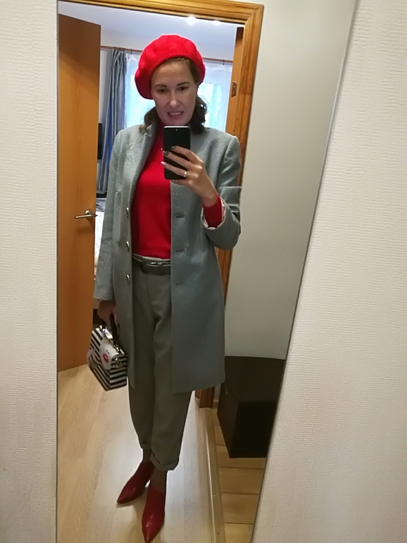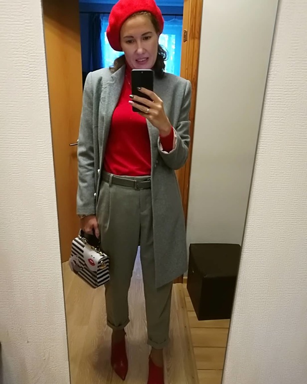 Или берет,или сумка,а то перегруз получается,ещё и брюки смелые))Без берета образ отличный!красное тебе идёт