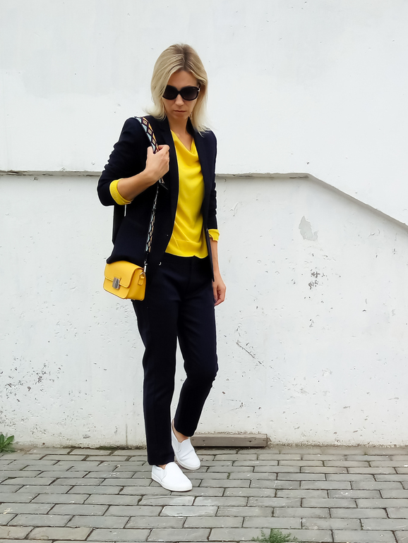 Последние 4 образа очень понравились, особенно чёрный костюм с жёлтой блузой и голубое платье с поясом очень хорошо смотрятся.