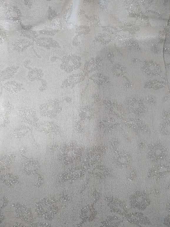 Была идея что_то из него сшить. Может быть, юбку интересную вечернюю с запахом или асимметрией. Или не мучаться и оставить как раритет?Ткань настоящая иранская парча, мамины запасы советских времен. Очень красивая серебристая с вышивкой.