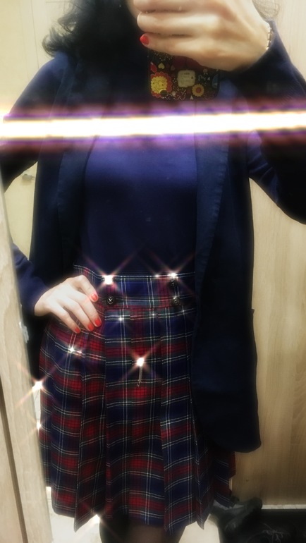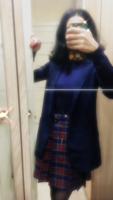 Эта юбка китайской школьницы🙈😂лежит у меня без дела, так как.... ну коротковата они мне. Не потому что возраст, нет). Просто мои ощущения. Ноги тоже хорошие). Просто не люблю короткое, не считаю это красивым. Но вот надев сверху жилет.... получилось очень даже. Силуэт вытянулся, и в целом комплект заиграл иначе. Не так, как будто я с уроков сбежала, а вполне себе нормально)