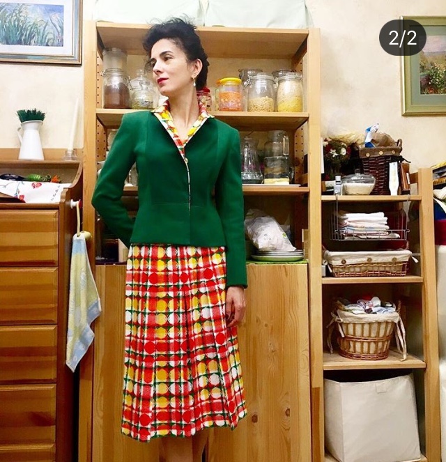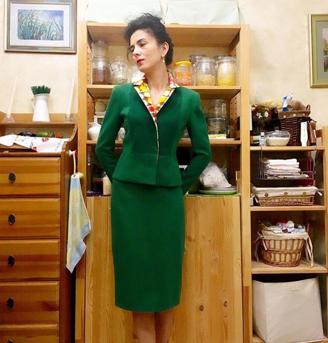 Юбка сначала планировалась одна. Ни о каком пиджаке я не думала. Но потом я купила зеленую ткань. Тоже шерсть. И сшили мы зеленый костюм. Но целиком зеленым мне он показался скучноватым. Поэтому и пришла мысль