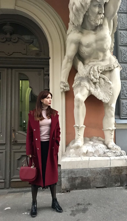 ПосоветуйтеДевочки, нужен совет. Можно ли носить вместе сумку и пальто бордового цвета ? И ещё подскажите насчёт длины платья. Не слишком ли оно длинное для этого пальто ?