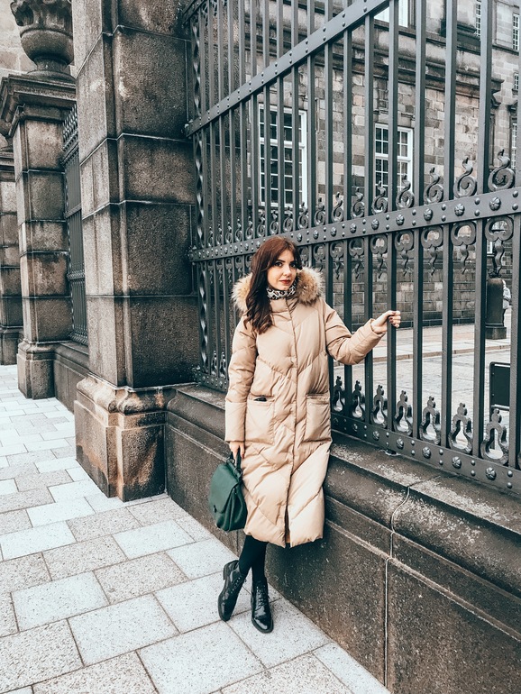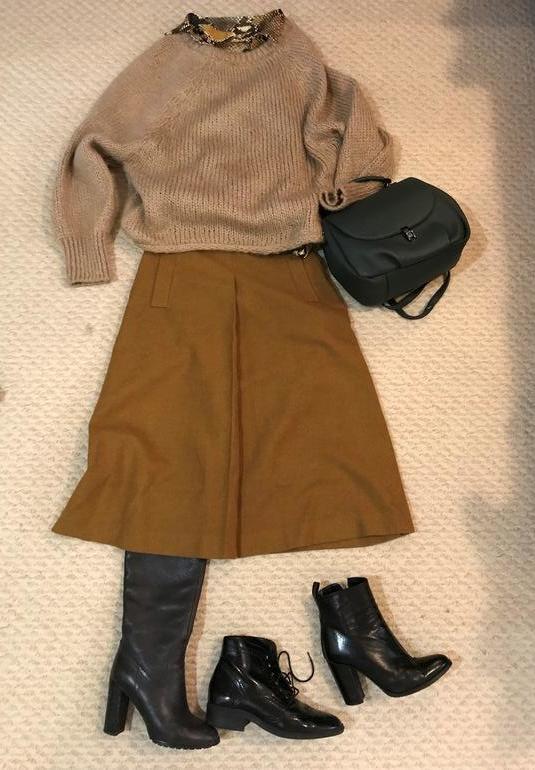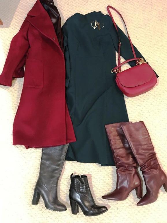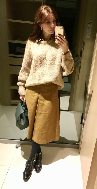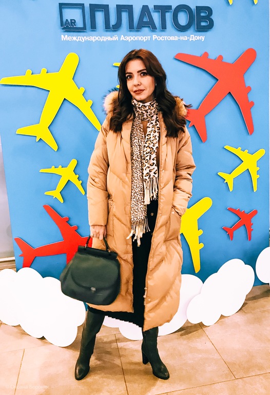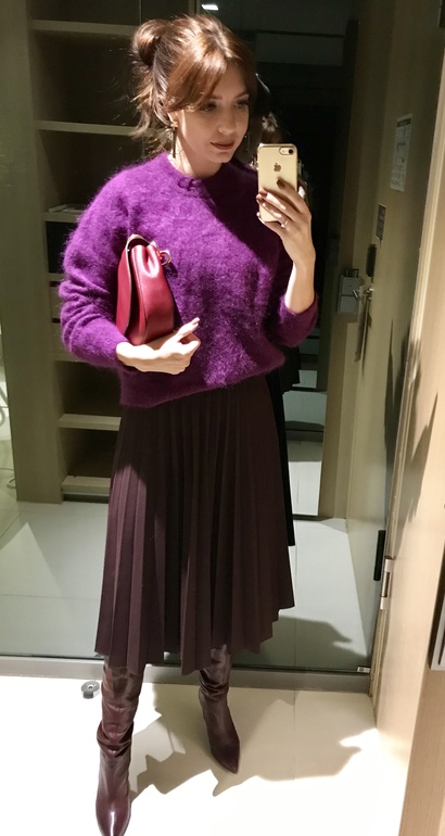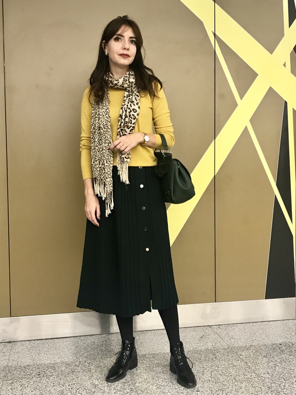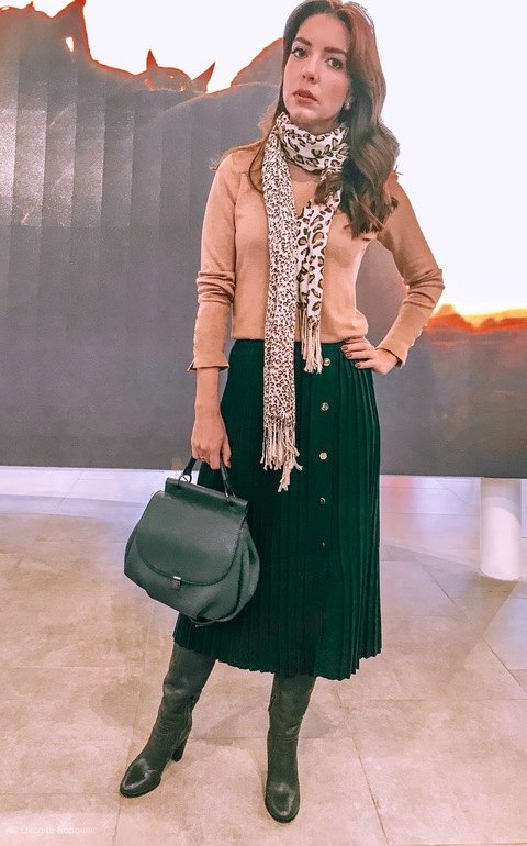 Для перелетов я выбрала темно-зеленую вязанную плиссе, пуховик и сумку большую .