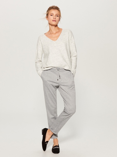 Скидываю Вам пример свитеров, которые можно было бы комбинировать с этими брюками: https://zakupki-de.com.ua/sale/11280-zhenskie-svitera. На сайте кстати есть много вариантов свитеров не такой грубой вязки.