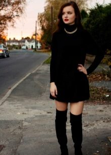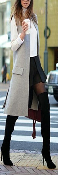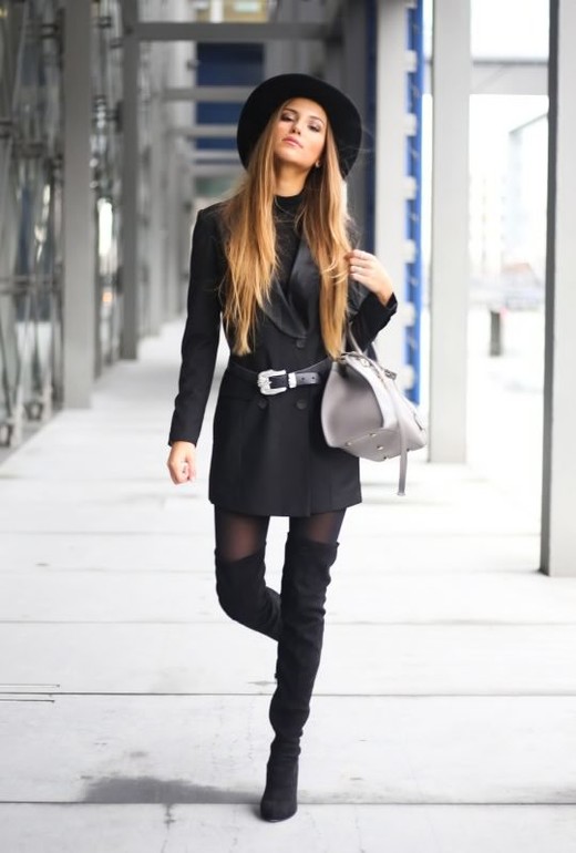 Тут многое зависит от пропорций самого образа, вот вариант со свитером Овер очень даже ничего. В остальных вариантах мне нравятся вообще бежевые ботфорты, которые удлиняют ногу, идут ко всему и не такие мрачные как чёрные, вот пример