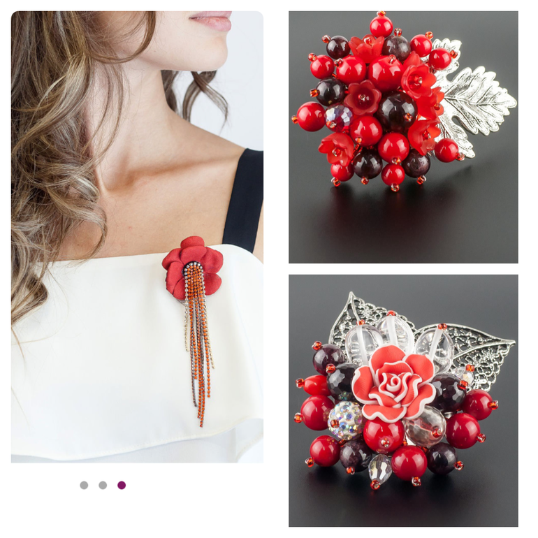 Брошь лучше лаконичную и серебряную (из белого металла). Как-то перебор с красным получается