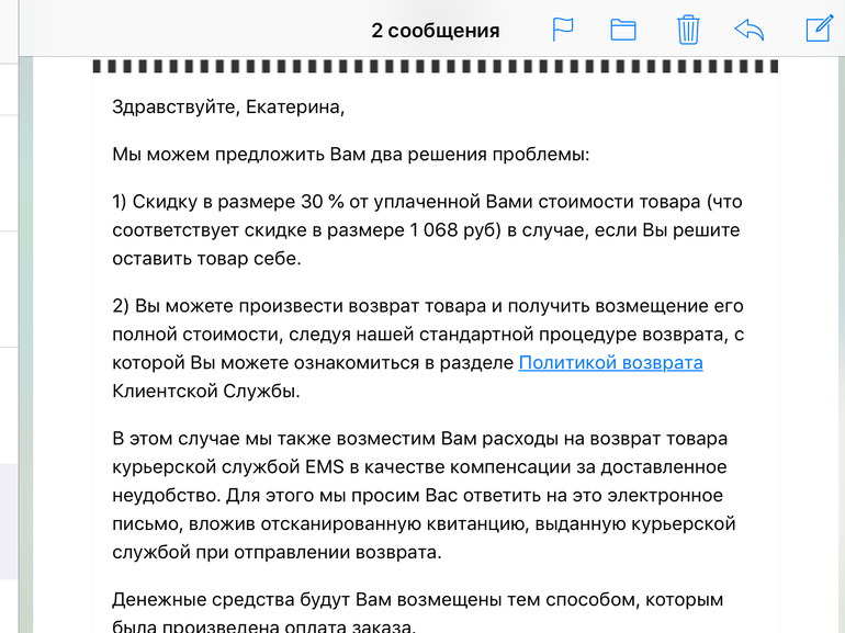 Это я к чему, а к тому, что нет никакого смысла оставлять себе бракованные и поцарапанные вещи, процедура возврата простая, доставку компенсируют, в бутылку не лезут. Имеет смысл, хотя бы, получить компенсацию.