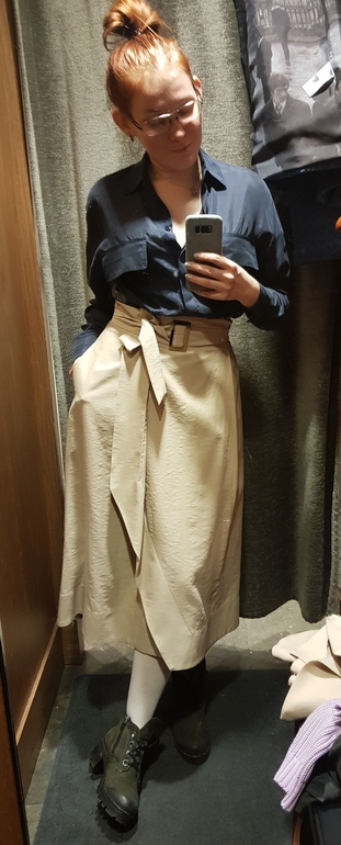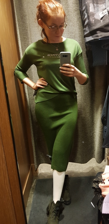 У кофты надпись хорошая, а юбка теперь покоя мне дает 🙈теплая, сейчас носить как раз самое оно. Но есть одно но! У меня уже есть подобная, только бежевая😭 и более обтягивающая, эта внизу довольно свободно идет