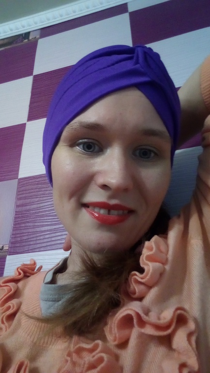 я не вижу ничего критичного в цвете. Просто тюрбан требует яркий макияж, вам нужно подрисовать брови, чтобы была четкая линия бровей! Можно подвести глаза. А вот красная помада может и не нужна. Но нужно пробовать :) И еще тюрбан не носить с оборчатой кофточкой :) А то слишком много оборчатости получатся :) Этот тюрбан скорее летний, можно носить с платьем -рубашкой, не слишком коротким...