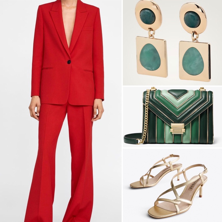 Образ 5. Красный костюм - это всегда вау эффект! Дополним его контрастным сочетанием с зелёным, а золото внесет благородности. Этот вариант определенно для особого случая ❤️