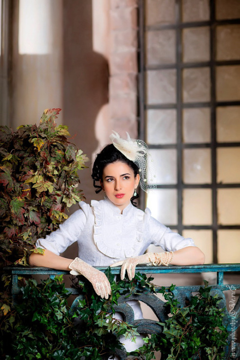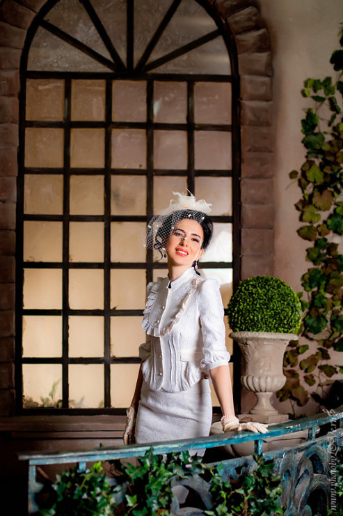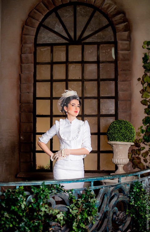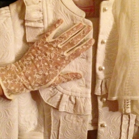 К белому костюму, я надела перчатки моей прабабушки. Она всегда ходила в тонких перчатках, никогда не трогала поручни в транспорте без них) Но именно эти перчатки почти новые, в них она надевала чулки, чтоб не рвать их ногтями)