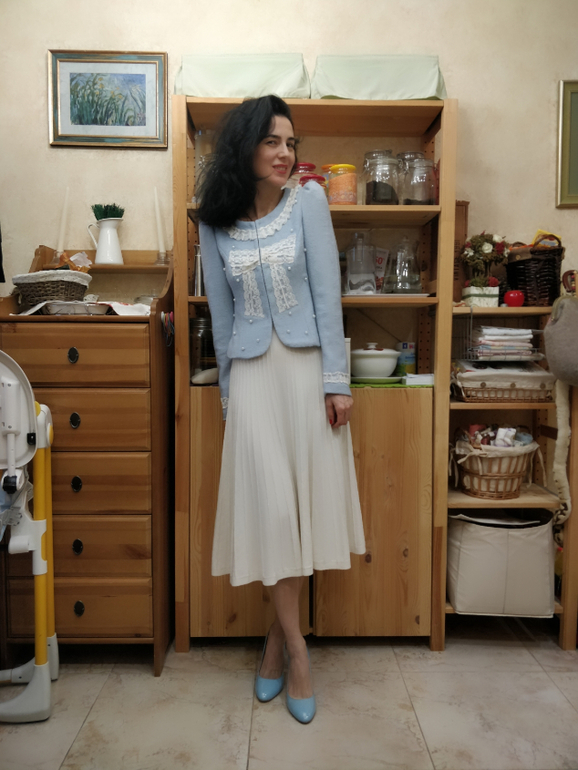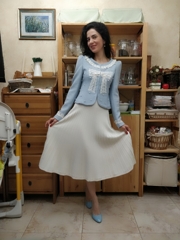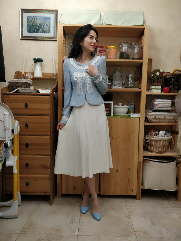 Далее, голубой пиджак. Он тоже был костюмом, но такие юбки я не ношу, она была пышная, но короткая, поэтому взяла один пиджак.