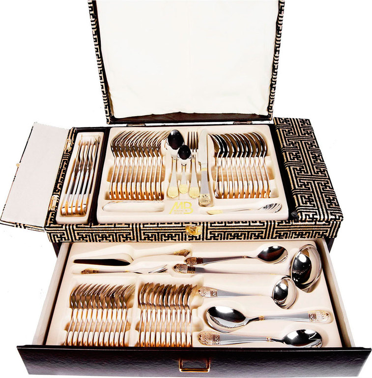 Есть у неё набор Mayer Boch в чемоданчике, там кажется 73 Прибора (на 12 персон)