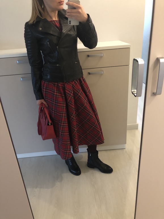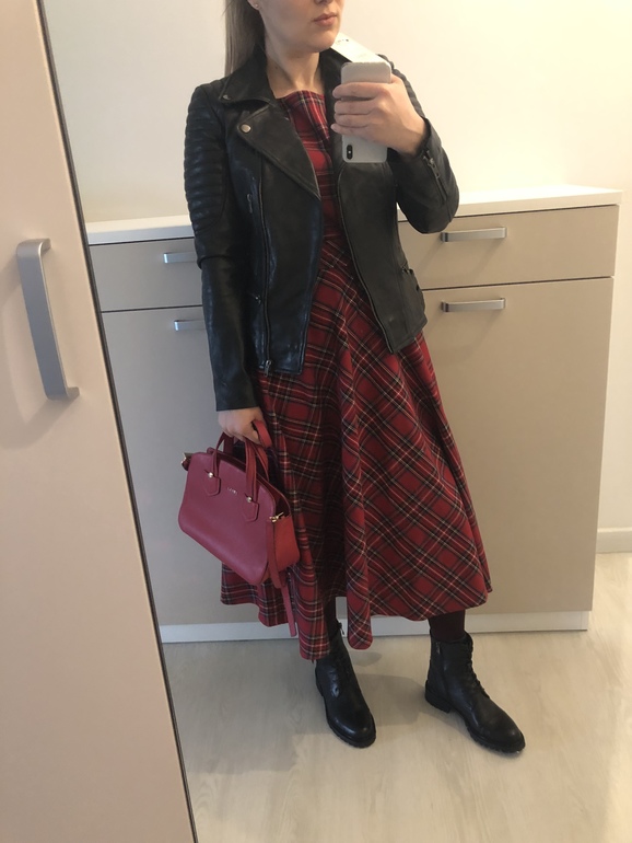 Отличная куртка! Как я Вам и советовала, платье с курткой отлично подружилось. А попробуйте зеленую сумку, а то красная смотрится тоже неплохо, но немного банально. А откуда куртка? ( не осилила все комментарии, сорри :))) а то вдруг уже отвечали)