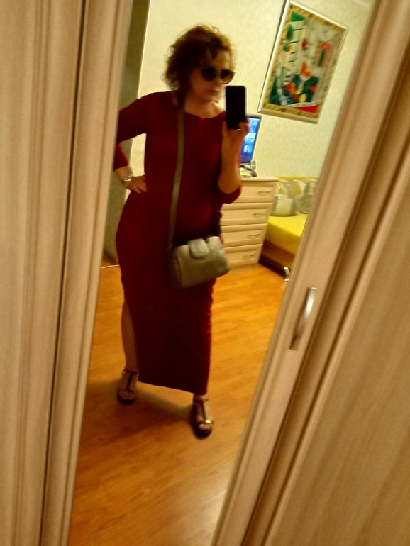 Мне понравилось, как Вы убрали волосы на первом фото, сразу такое открытое благородное лицо. В платьях Вам очень хорошо)