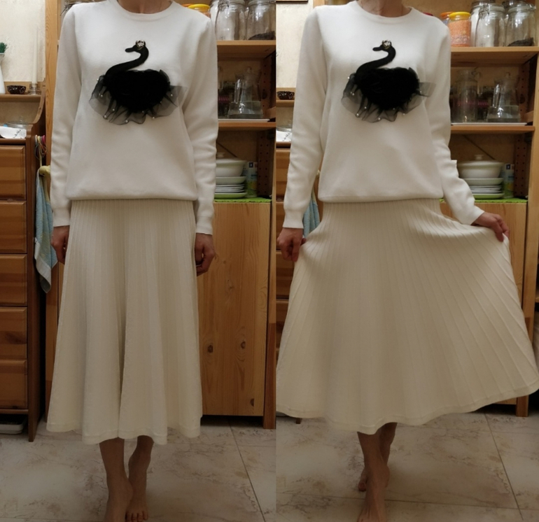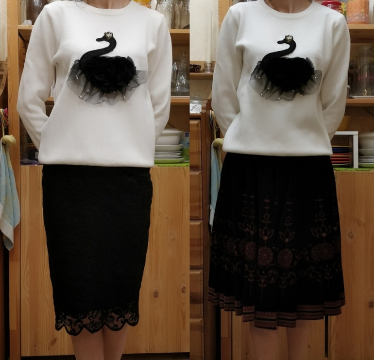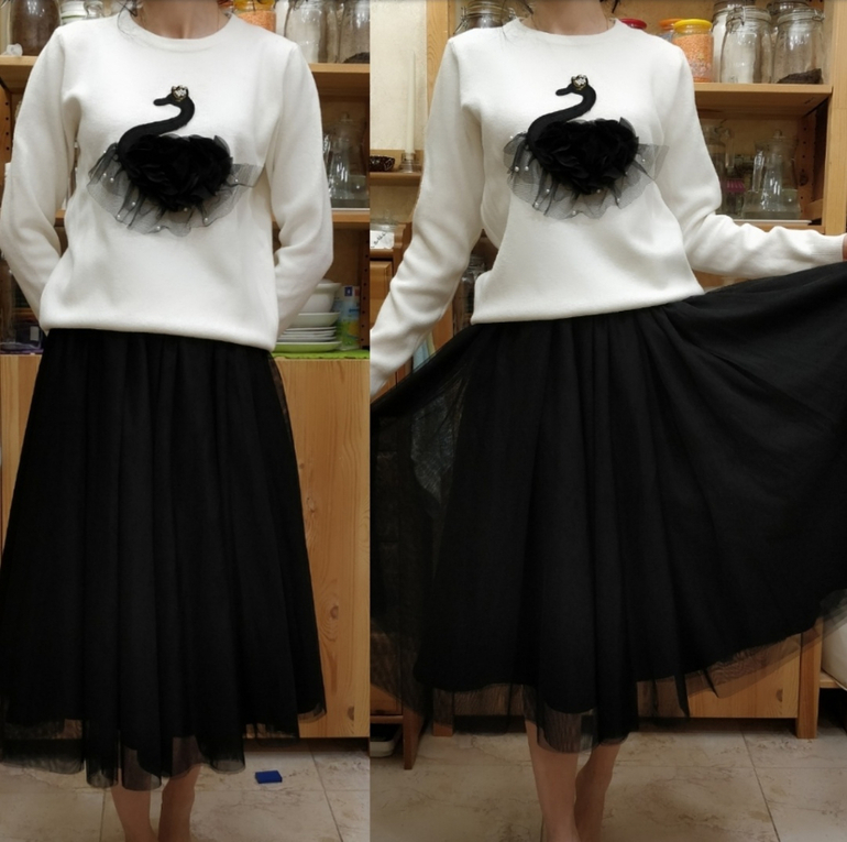 Юбка пачка это уже антитренд, но она у меня есть), ношу по случаю, под настроение, избавляться не собираюсь. С лебедем они конечно просто идеальный комплект. Жаль, что у меня его не было, когда юбка пачка была на пике моды. Но померив с другими юбками , мне тоже понравилось)