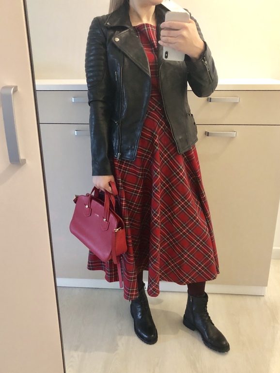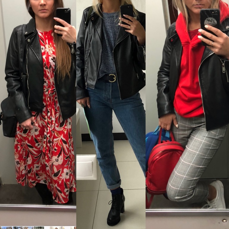 Я ношу так, со всем чем угодно. Сейчас правда модны косухи по свободнее, но мне моя больше нравится, главное не брать совсем в обтянут и короткую