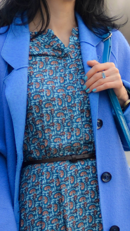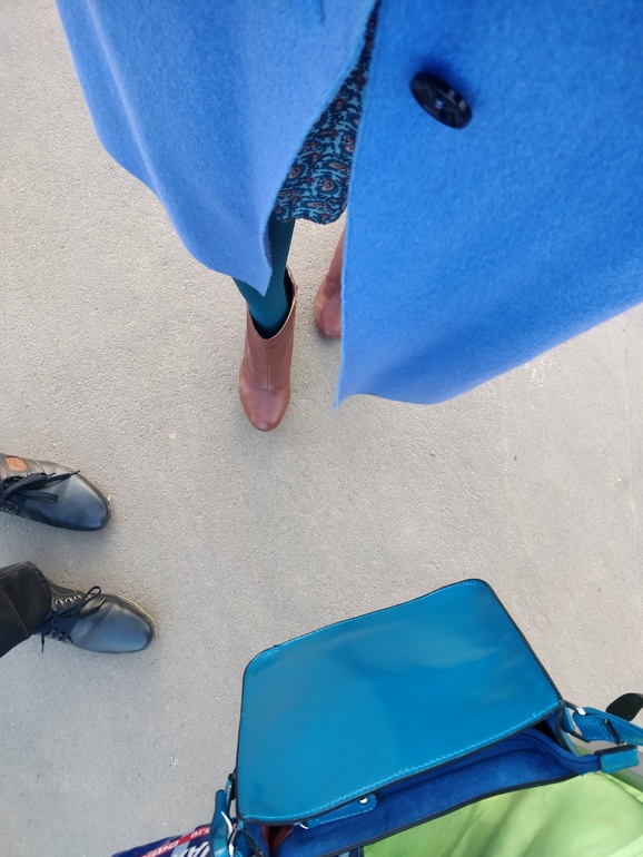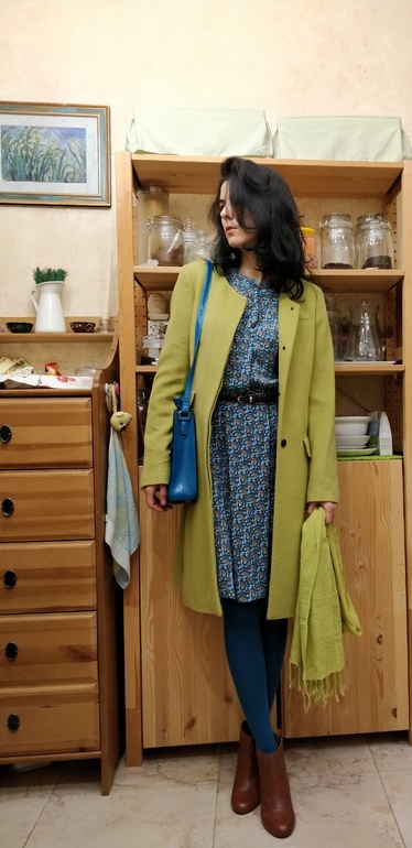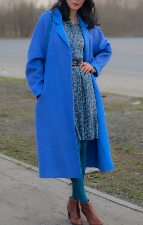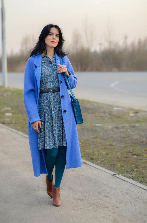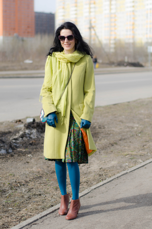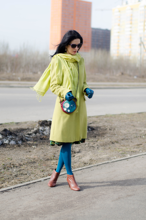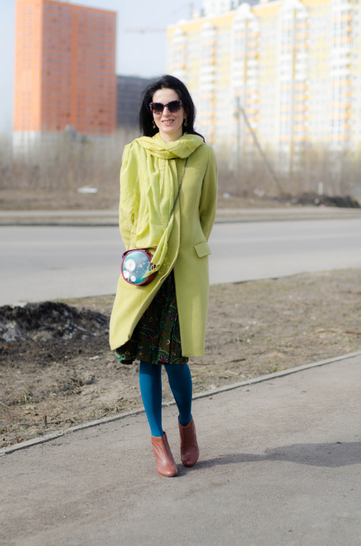 Платье с огурцами очень хорошенькое и цвет сумки красивый. С салатовым пальто сочетание синего и зеленого - это так необычно и ярко, я бы не додумалась, вам очень хорошо.