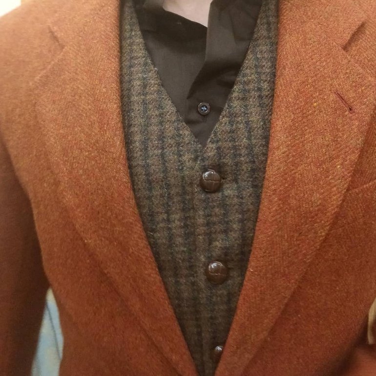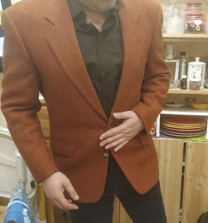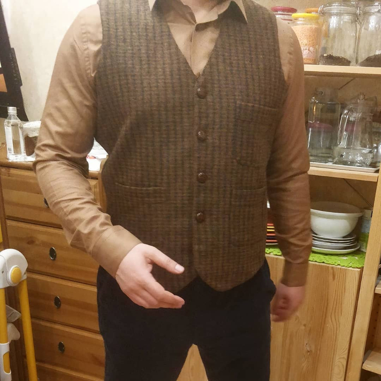 А жилет, как раз по фактуре очень подходит . Пиджак шерсть, под него тонкое никак. Мы и искали именно такую фактуру. Вырез хорошо было бы не глубже на мой взгляд, а наоборот закругленный. Но таких не было. А так получается вырез уголком на пиджаке и на жилете, вот и не совсем прям идеально. Под вырез уголком лучше бы вырез на жилете круглый, обычный. Но муж крупный, жилетку еле нашли))) выбирать не приходилось.