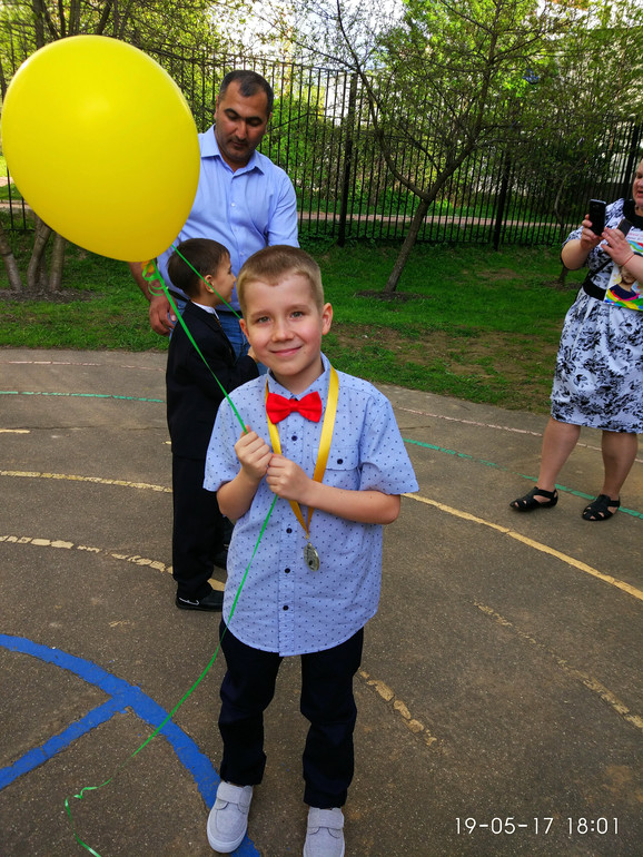 Мой был так одет. Но у нас просили строго, темные брюки, белая рубашка, я решила все-таки взять рубашку с принтом. И до сих пор эта одежда в самый раз, иногда так в школу одевается.