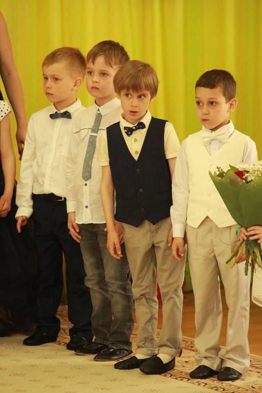Из классики мерили светло-голубые брюки HM , но размер не нашла, разобрали + рубашка. В итоге купила кэжуал ярко-синие брюки + рубашка и бабочка. На ногах были слипоны . Получилось из разряда "стиляг". Дети в саду в серых и черных костюмах как-то совсем не смотрятся, ИМХО