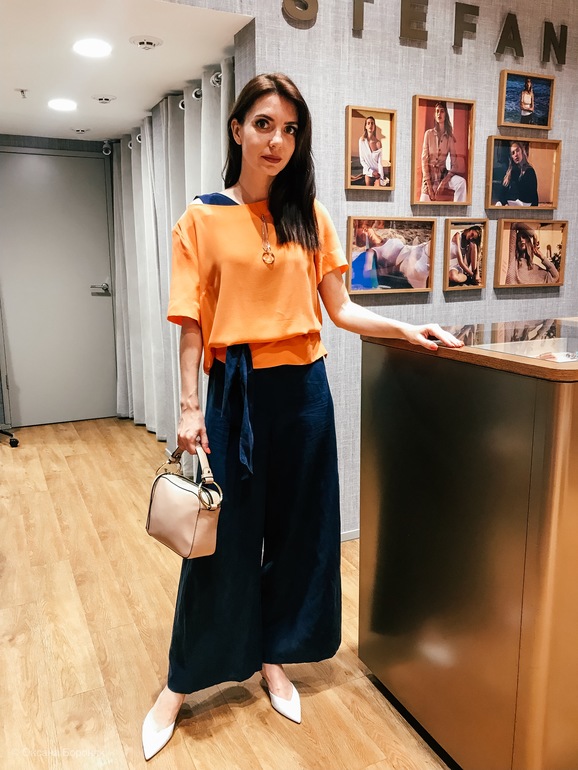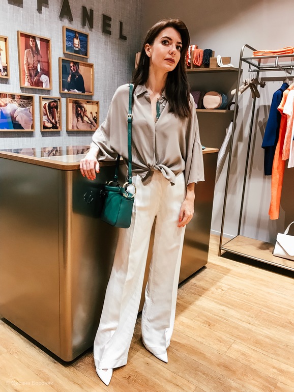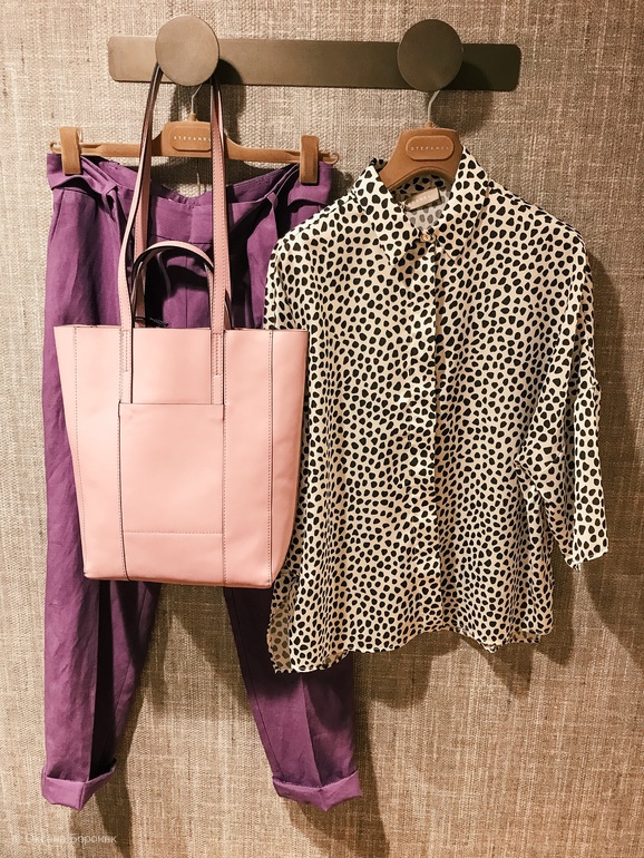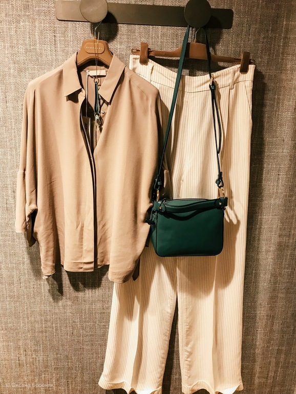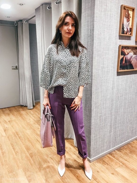 У меня был акцент на брюки в этом комплекте ) сумка в той же палитре, блуза нейтральная и по цвету и по принту