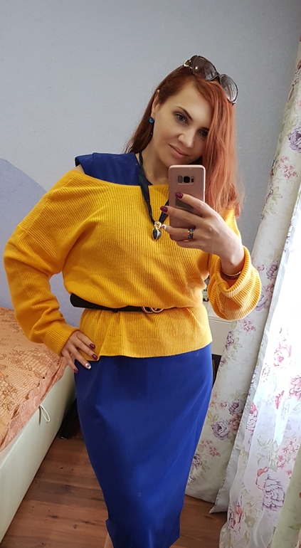 Оксан, сама красоточка)) А вот свитер в тандеме с платьем мне не нра. Для многослойности ему бы пообъемнее быть..и ремнем сильно затянут. Плюс рукава (верх платья) слишком широкие для такого ансамбля, если спускаешь на плечо.