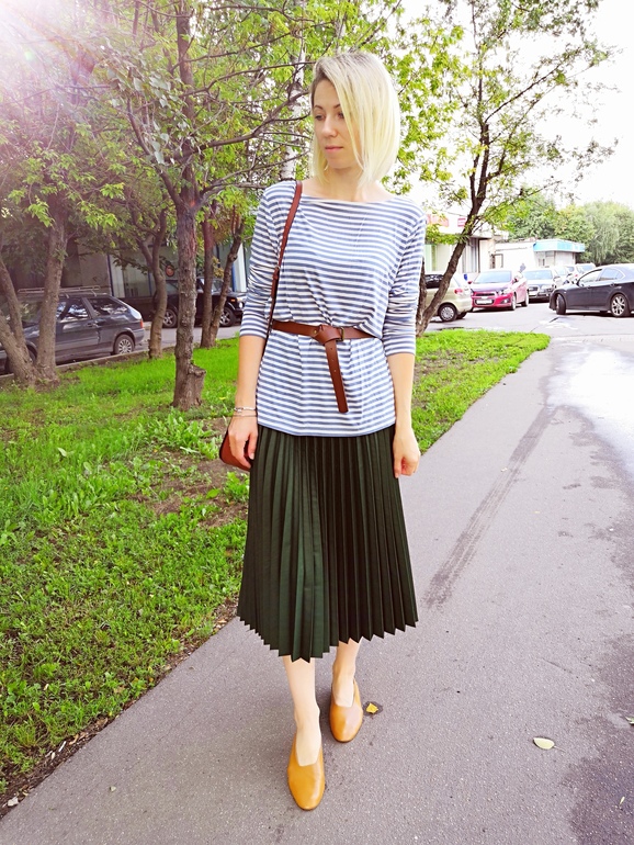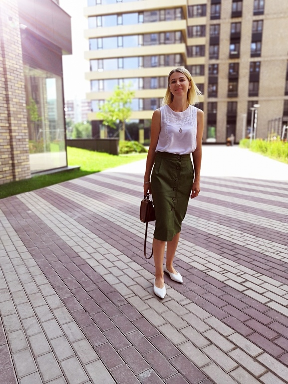 Красота! А что за белые туфельки на Вас - там где Вы в юбке цвета хаки? Давно безуспешно ищу подобную модель - узконосую, без каблука.
