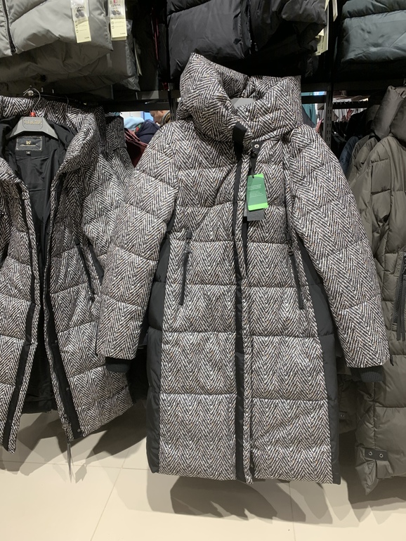 Я бы не стала брать. У меня предубеждения против таких принтов: изображение ткани в рубчик, нанесенное на гладкую поверхность пуховика, смотрится немного дешево. То же самое относится к пуховикам с принтом а-ля свитер с оленями. Поверхность либо тканая, либо нет. Третьего не дано.