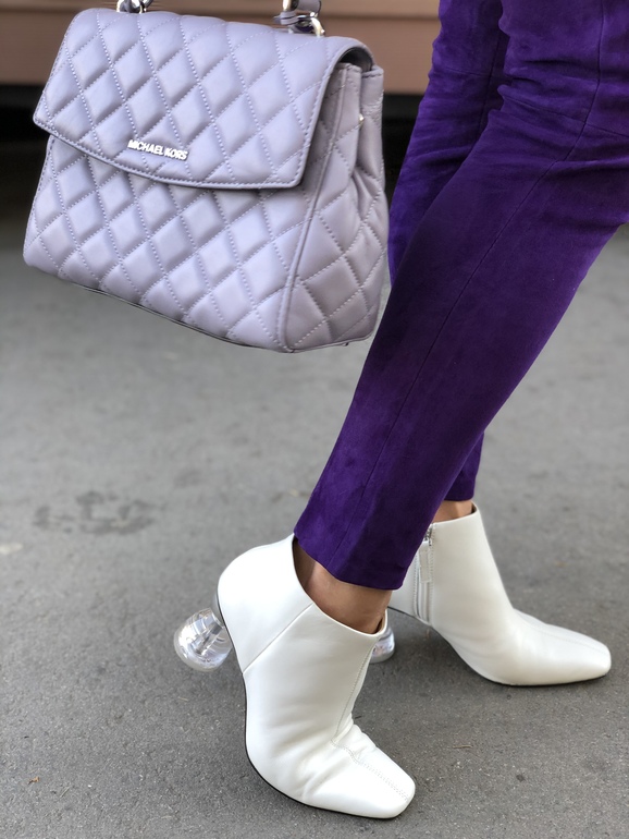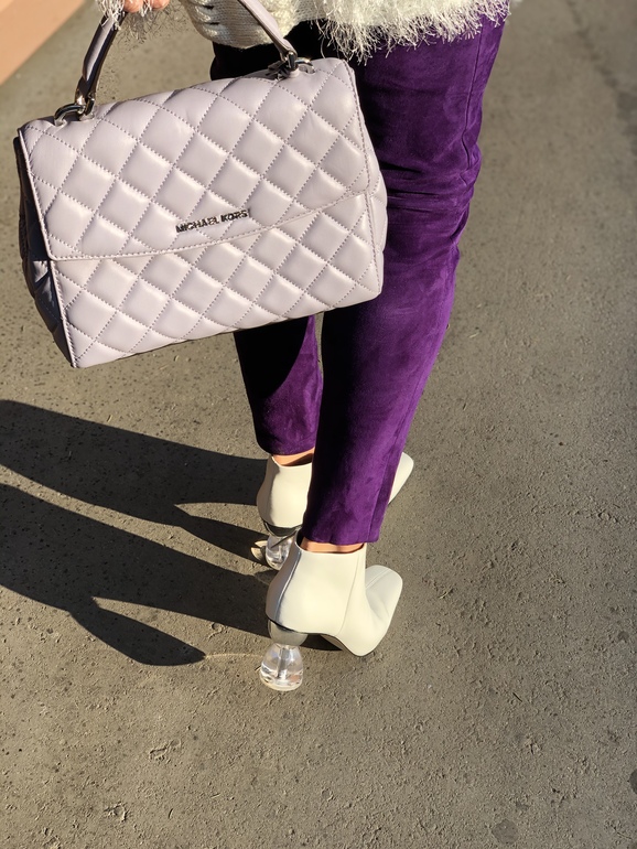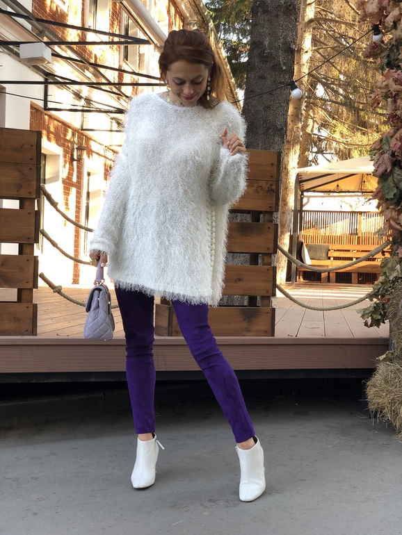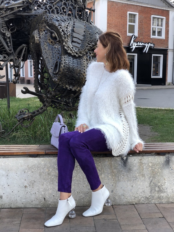 Очень понравилось сочетание фактур- волосатость пуловера, бархатистость Брюк и прозрачность каблука) и цвет)))