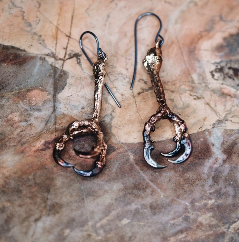 Вот серьги. Гальваника. Там внутри, под слоем металла, отрезанные лапки когда-то живой птички. Производитель обещает отсутствие запаха и внимание окружающих. Купили бы? Носили бы? Что вообще думаете о таких вещах?