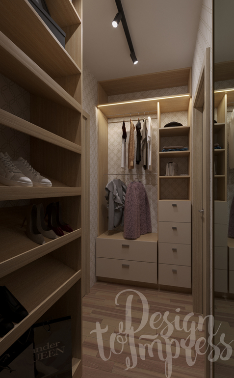 А что вас смущает? По-моему все очень даже нормально выглядит ) Если вы хотите гардеробную «как на картинке» это нужно соблюдать принцип единообразия, все сортировать по цвету и длине вещей. Плюс совместная с мужской гардеробная не будет в любом случае выглядеть «вау», в идеале две отдельных. А по функционалу наполнение также организовывается как в обычном шкафу, на вешалках блузки/рубашки, жакеты, на открытых полках трикотажные/растягивающиеся изделия. У меня на прошлой квартире была гардеробная, я поняла что это не мой вариант. Сейчас только шкафы. У меня нет желания поддерживать идеальный порядок на полках, короче не моя тема )) Потому что кроме одежды это еще сумки, ремни, шапки и тд и тп. Муж у меня никакой красоты поддерживать не будет, те это опять моя головная боль. А обувь на открытых полках это просто мой страшный сон )) Так что если у вас есть желание и время на поддержание порядка, то все будет ))