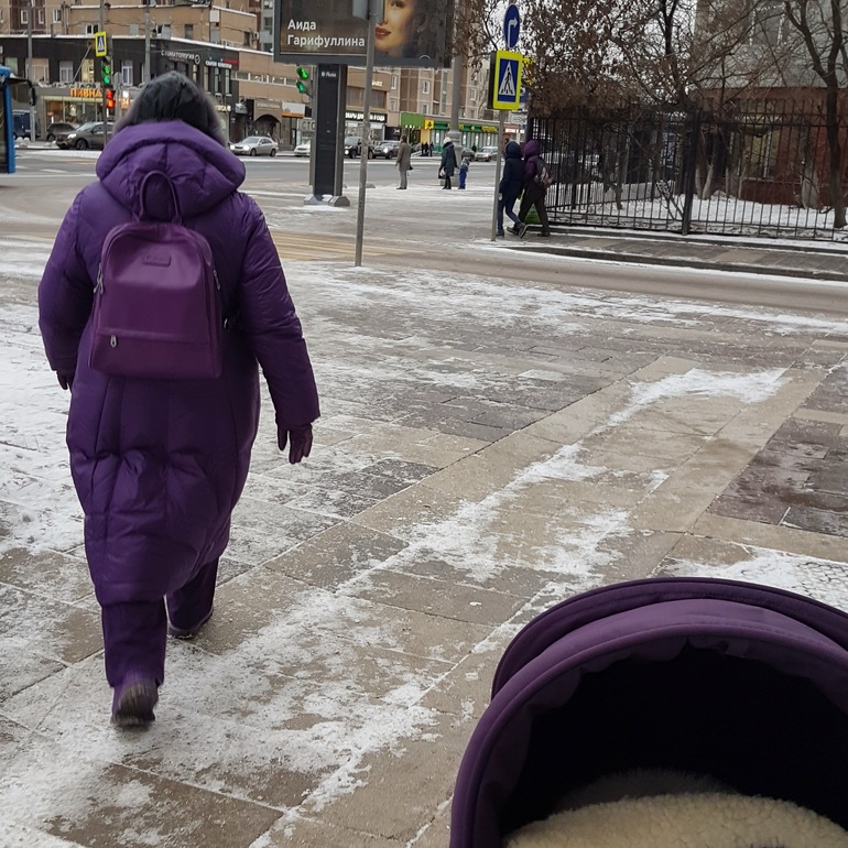 Прогуливаясь с фиолетовой коляской, встретила даму полностью в фиолетовом - обувь, брюки, перчатки, пуховик, рюкзак, шарф...