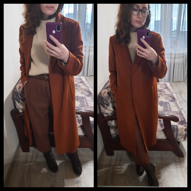 Она получилась двухсторонняя, шоколадно-синяя. С коричневой стороной надеваю коричневые вельветовые брюки, с синей стороной соотвественно синие брюки и водолазку. Ношу с ремнем или без, завернувшись как в одеяло.
