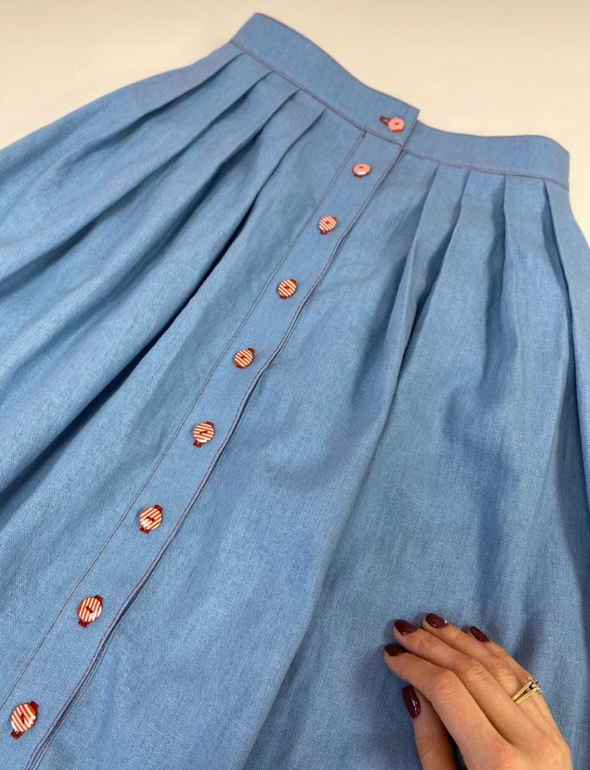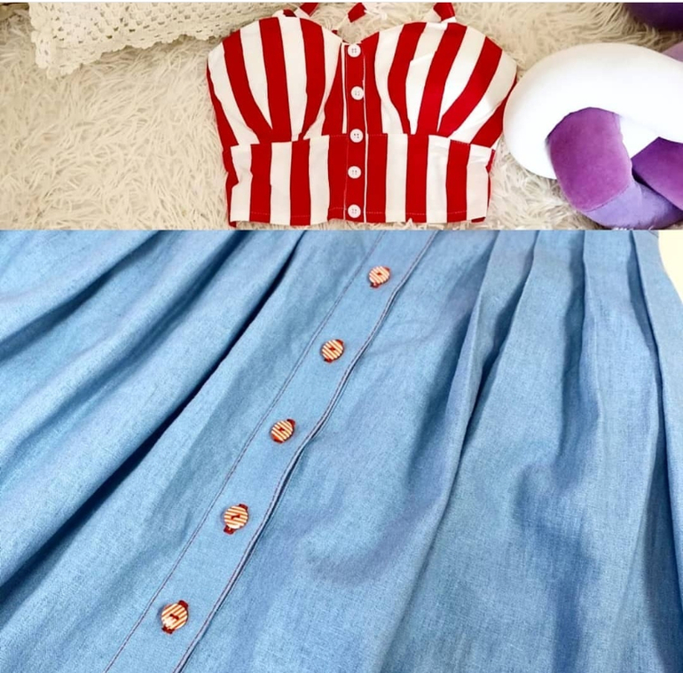 Очень хорошенький костюмчик вышел. А мой летний топик подошёл ей под пуговицы) Теперь она будет себе шить такой же)