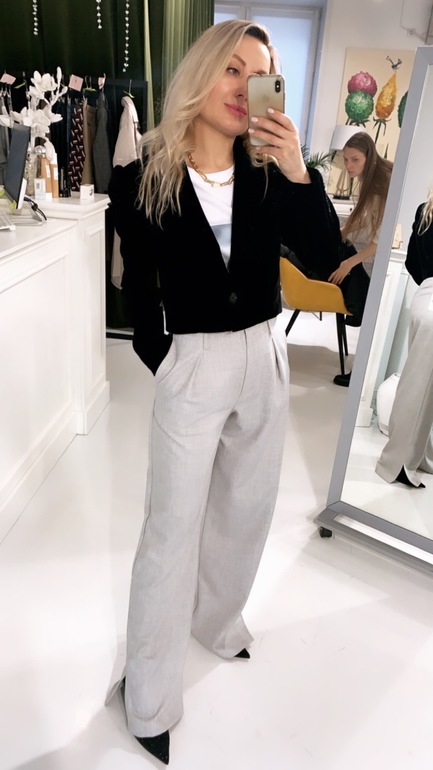 Из этого шоурума только один пример: брюки-палаццо и укорочённый жакет с акцентным плечом- так же очень актуально в этом сезоне.