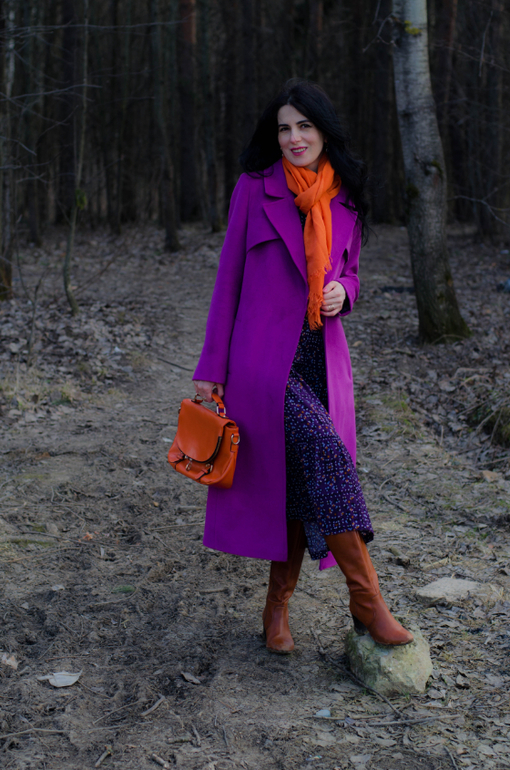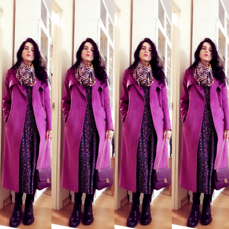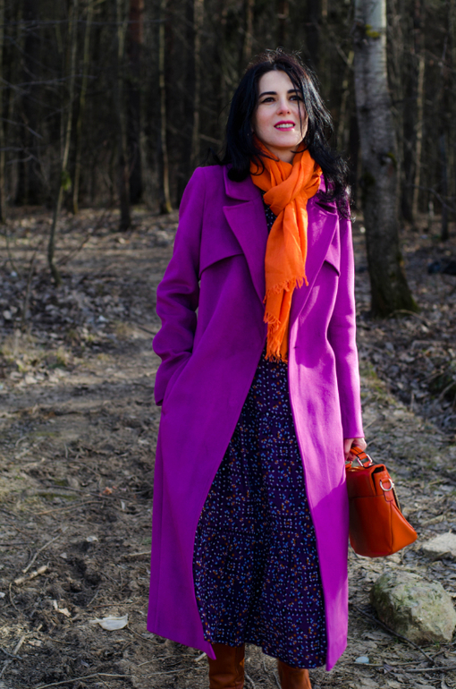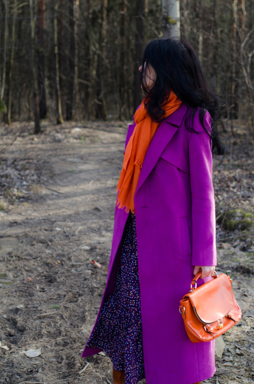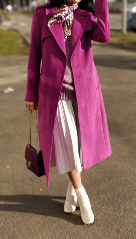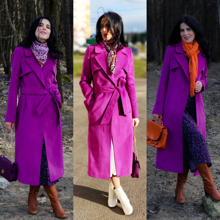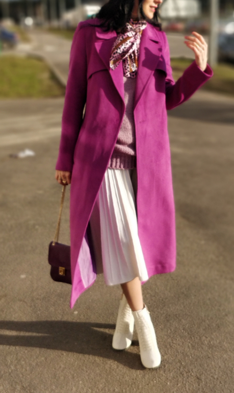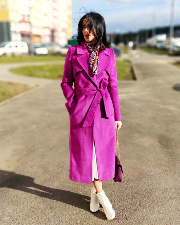 Пальто очень яркого цвета фуксии. На фото, конечно , добавлен контраст, но оно и