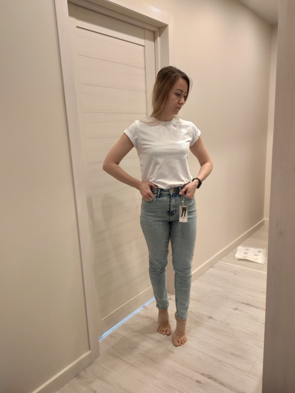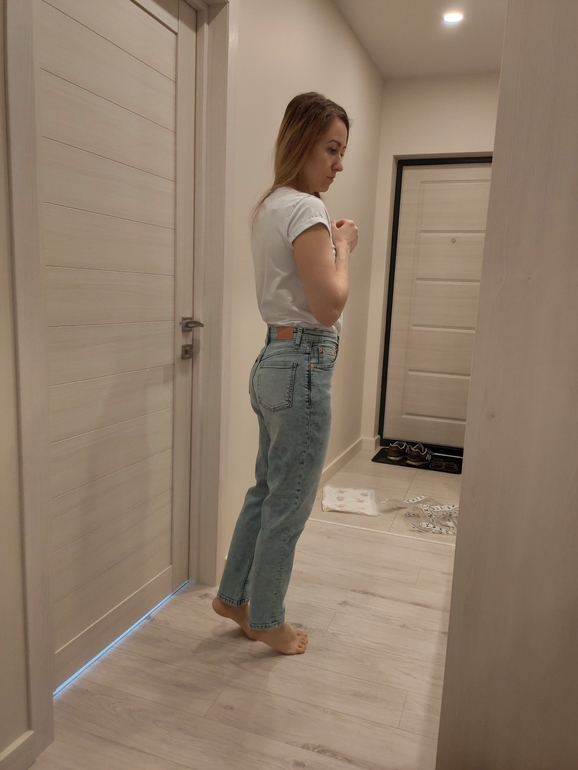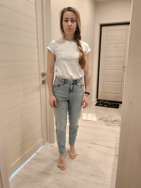 Примерочная2 разных размера. И те и те комфортно. Одни свободные везде, вторые типа скинни сели. Заявлено как mom...