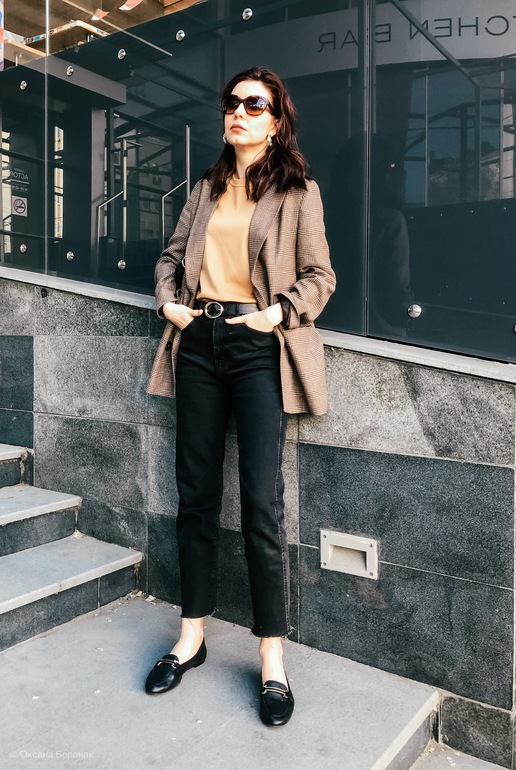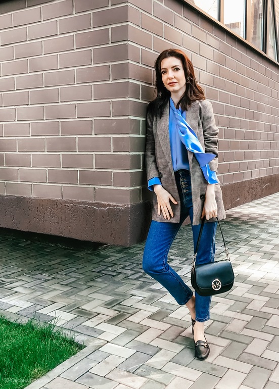 Блуза с бантом, джинсы и лоферы.