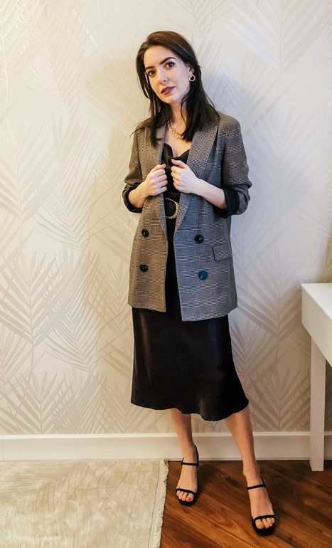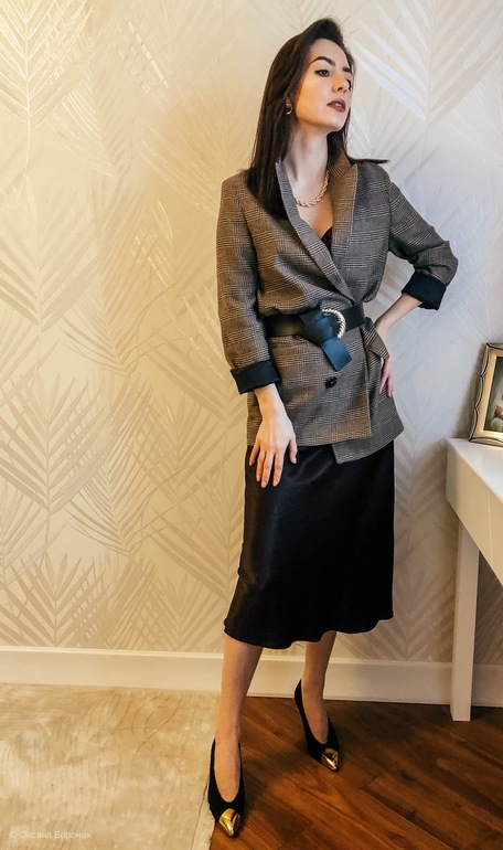 Тут вышло 2 варианта - Один для свидания )) когда платье с поясом, а блейзер сверху. Второй - для мероприятия. Когда блейзер с поясом. Цвет платья - темно-коричневый.
