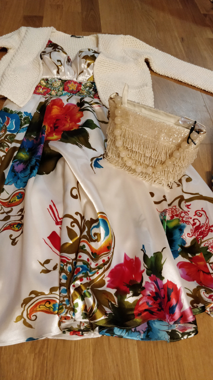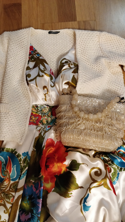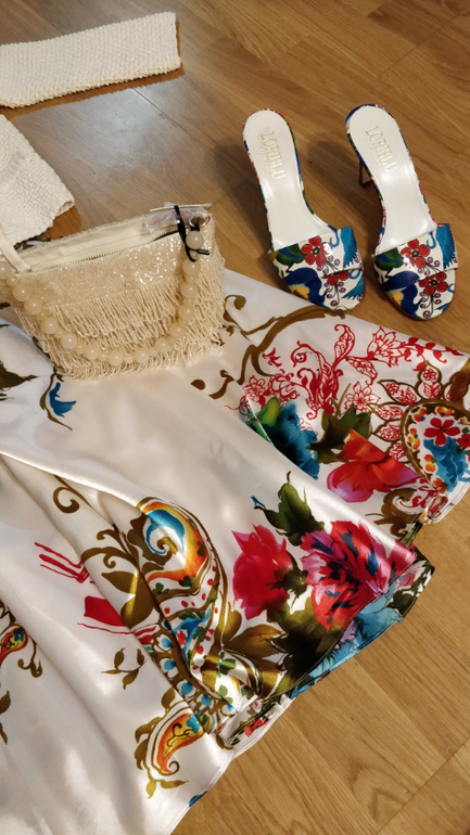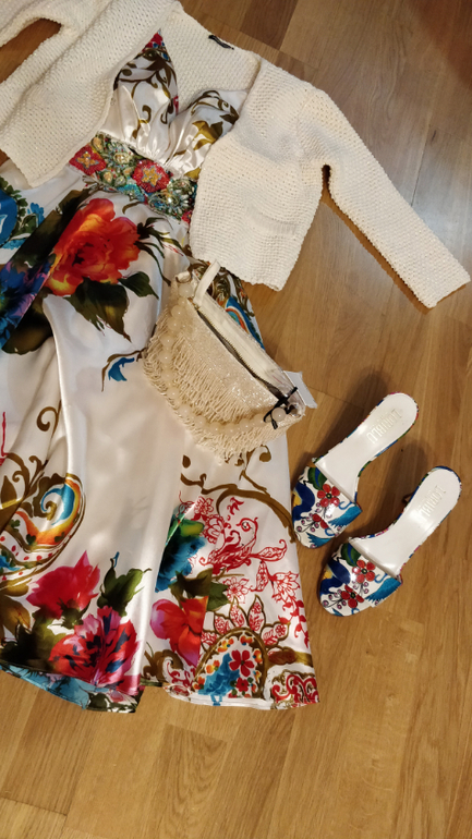 Выбрала её чисто визуально , даже не думая с чем буду ее носить. Собственно по мне она много с чем подойдёт, и с джинсами можно обыграть, и в театр сходить. Но уже дома, вдруг сложился пазл определенного образа. Есть у меня платье, которое я так никуда и не надела. Только фотосессия была в нем сто лет назад) И вот оно висит и ждёт своего часа. К нему случайно, как то купила жакет, и повесила сразу вместе с ним на вешалку, и босоножки мои любимые знаю, что подходят. И вроде вот образ готов, бери да и иди. Но всё не по случаю оно , как - то было. Просто гулять слишком нарядно. Свадеб ни у кого нет) Но теперь всё стало ясно. Просто образ ждал свою сумочку))) Так что точно должно найтись мероприятие, теперь то уж)))))