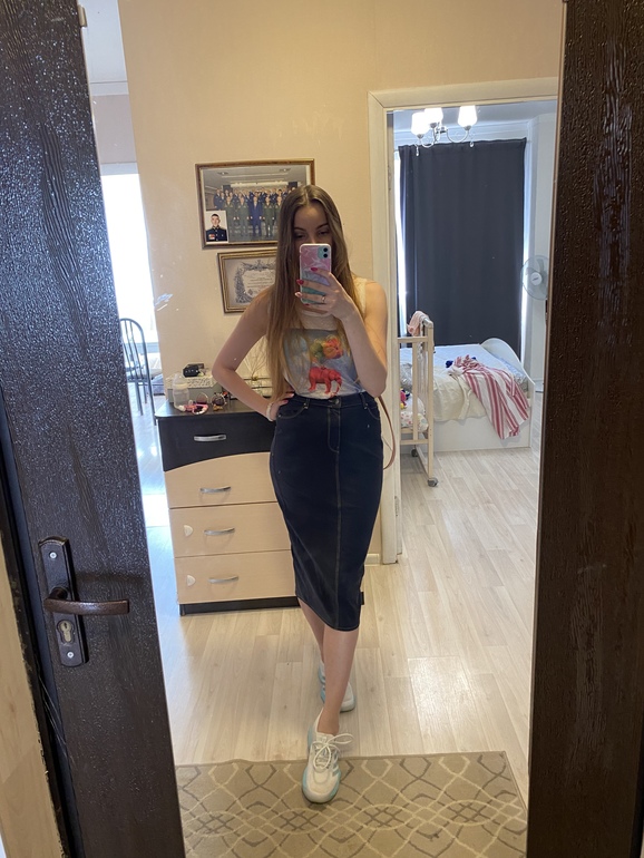Да согласна с девочками ,что на юбке не хватает разреза хочется больше воздуха ну и майка не сюда