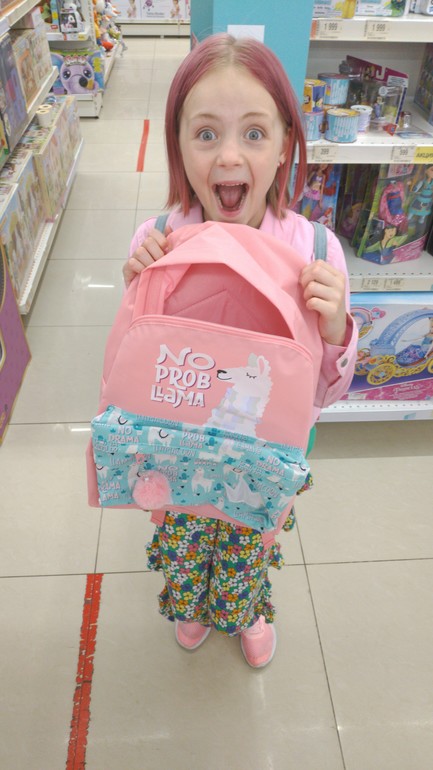 Так выглядит человек, которому дали купить, что он выберет без права обсуждения. Теперь, у нас есть весь комплект с ламой:)))) ластики, ручки, карандаши, линейки, ножницы, рюкзак, мешок:))))))и губная гармошка!