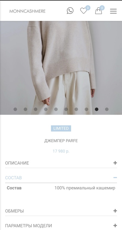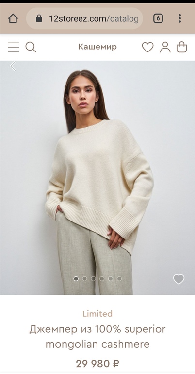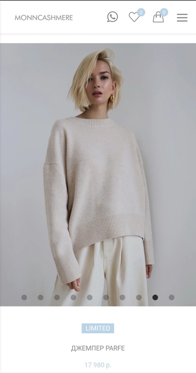 Далее посмотрим, что у MONNCASHMERE. Они продают 100% кашемировые джемперы за 18к. Модели ну очень похожи: оверсайз, манжеты, заниженные плечи, плотная вязка.