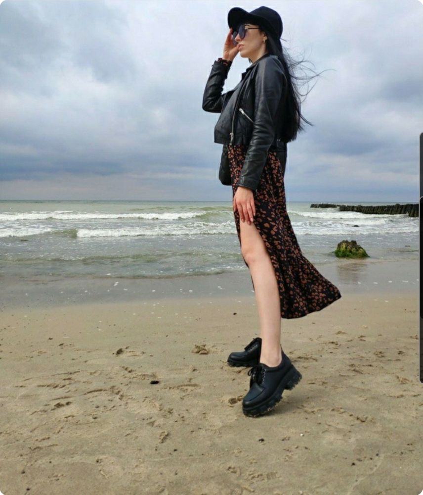 Сейчас же решило платье не убирать, а попробовать его преобразить и носить ещё и осенью. У нас довольно тепло. Сверху косуха, под низ чёрные колготы и какие нибудь туфли и ботинки. Но все что я не меняю из своего гардероба ну никак не подходит. Хотелось бы что-то на каблуке, но устойчивом. Чтоб можно было бегать весь день