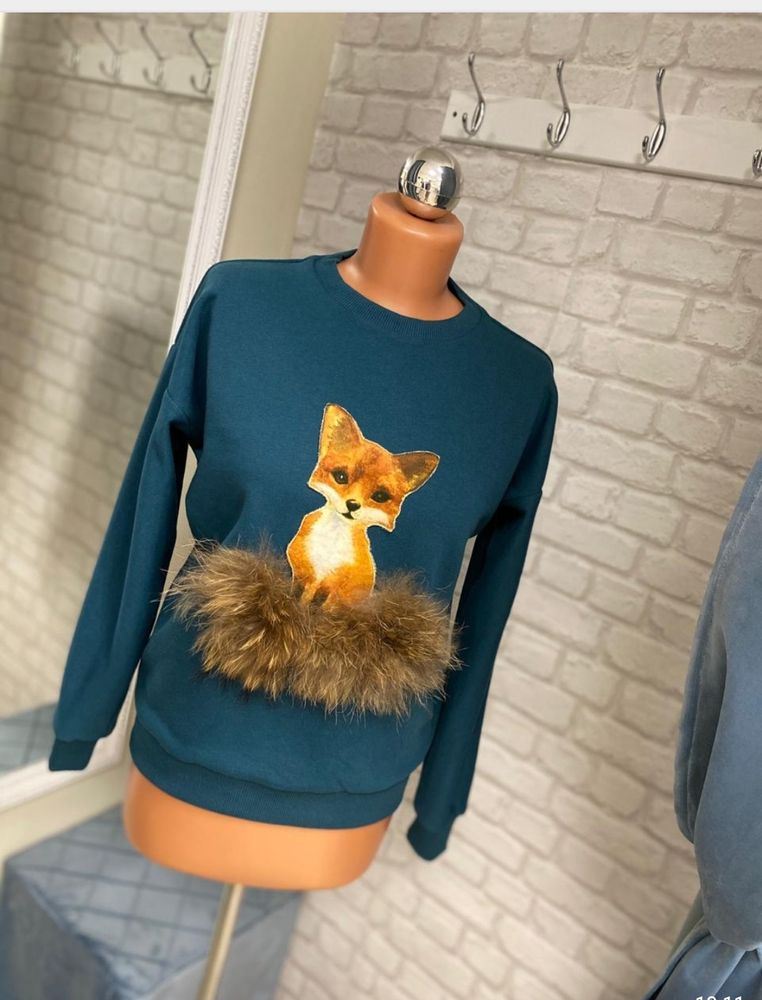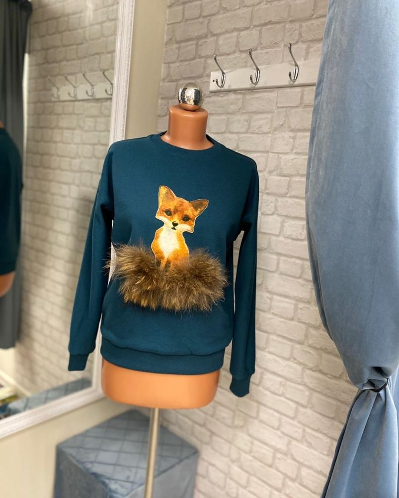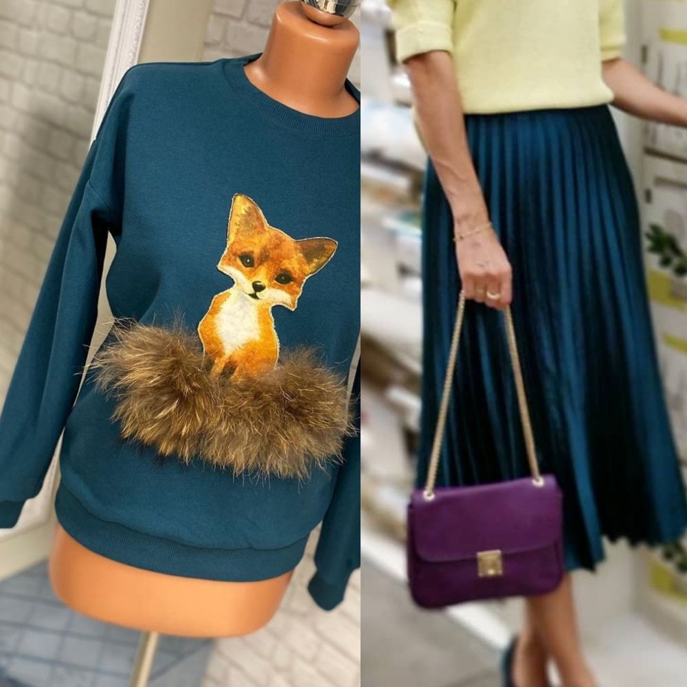Серый надоел, завязки отрезала ещё год назад, ткань свитера тоже не очень нравилась, а вот с лисой расставаться не хотела. И поэтому сшили мне новую кофту, а на нее перенесли лису) Цвет для лисы мне с самого начала хотелось зелёный. Поэтому так и заказала.