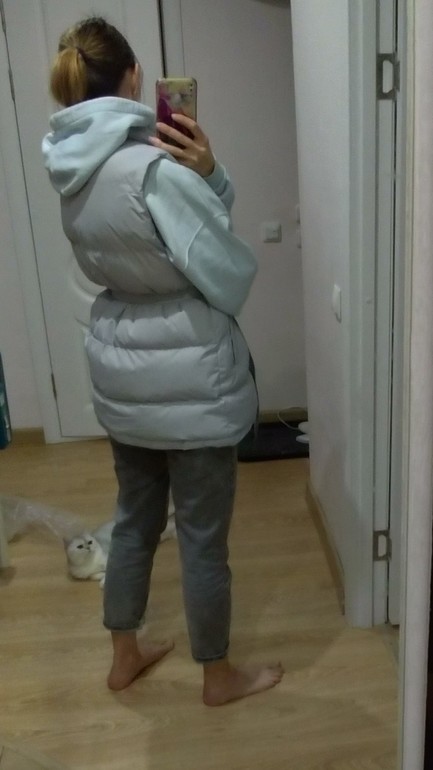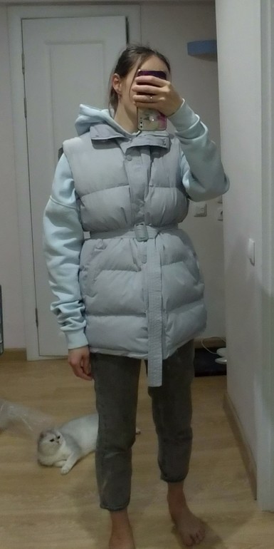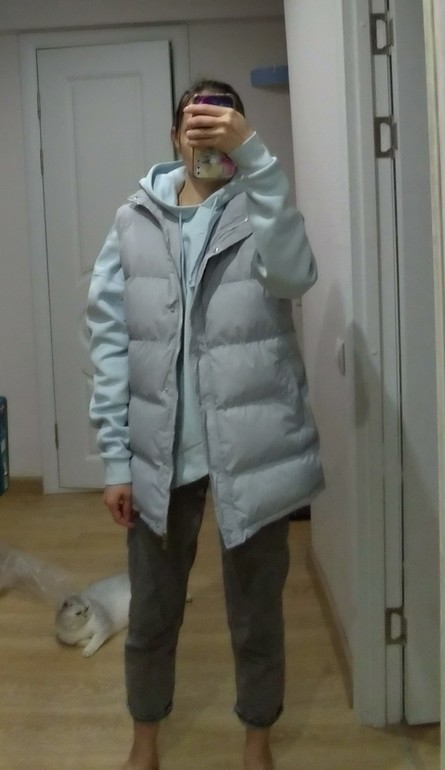 Не знаю почему все написали, что надо сдать. Мне нравится, но если вам не комфортно, то сдавайте. По такую жилетку худи с джоггерами утепленные и кроссовки. Если учесть, что худи тоже объёмные, то на меньший размер жилетки будет маловато.