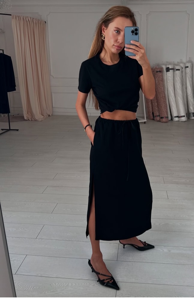 У меня длинные платья, длинные юбки, свободные, брюки очень свободные и широкие. Для примера, топ льняной на тоненьких лямочках, при этом свободный. Ненавижу , когда все липнет.