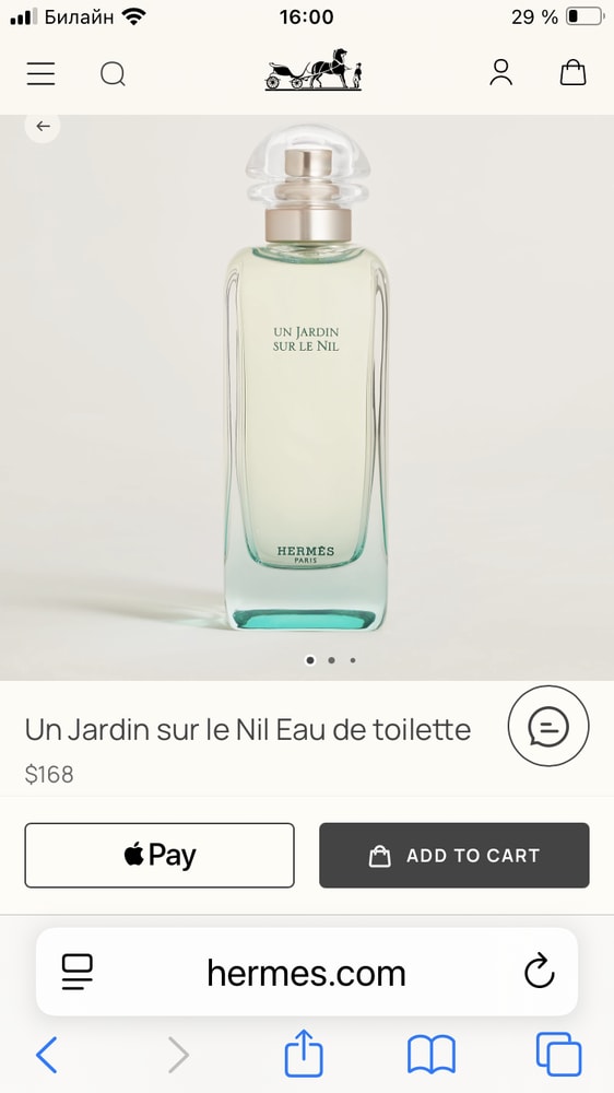 Есть мой любимый аромат , Сады Нила от Hermes. Пользуюсь…13 лет. Ну те я парфюм консерватор такой. Самый свой первый флакон я купила в Европе. 100 ml за ок.100-120 € . сейчас , на офиц сайте, они стоят больше. 168$