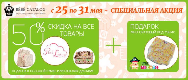 При покупке сумки для мам всемирно известного бренда Pink Lining - скидка 50 % на весь ассортимент и многоразовый подгузник Little Pirate в подарок!!!!))))